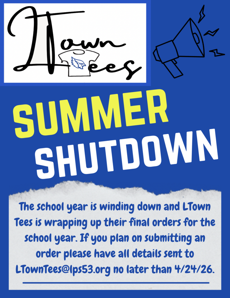 LTown Tees has had an amazing year, with more group orders than we could have ever hoped for! We are so thankful to our schools and community for helping our students learn these essential job skills. That being said, with the year wrapping up and our senior staff members leaving us for bigger and better things, we will be closing orders on April 24th. If you have any group orders that need to be completed by the end of the year or prior to August, please submit these prior to this date!